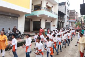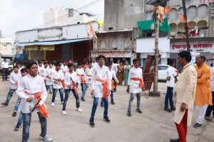 सिंहगर्जना ढोल पथक व विद्यार्थ्यांचे लेझीम पथकाने उपशिक्षक वाय पी पाटील यांच्या घरापासून गणपतीची मूर्ती बैलगाडीवर विराजमान करून मिरवणूक शहरभर काढण्यात आली. याप्रसंगी विद्यार्थ्यांनी ढोल ताशाचे व लेझीमचे सुंदर प्रदर्शन केले. त्यांच्या या प्रदर्शनाने शहरातील नागरिकांनी विद्यार्थ्यांचे कौतुक केले. या सोहळ्यामध्ये संस्थेचे अध्यक्ष मा. हेमलालशेठ भाटिया, सचिव मा. ललितजी उपासनी संस्थेचे मार्गदर्शक प्रा रमेश महाजन तसेच मुख्याध्यापक जीवन पाटील , मुख्याध्यापक एस एस पाटील, बालकमंदिर विभाग प्रमुख मीनाक्षी वारुळे तसेच संस्थेतील सर्व पदाधिकारी व शाळेतील सर्व शिक्षक. शिक्षिका,शिक्षकेतर कर्मचारी सहभागी झालेले होते. या ढोल पथक व लेझीम पथक यांना शाळेतील क्रीडा शिक्षक एस एल सूर्यवंशी, योगशिक्षक आर.डी महाजन यांनी मार्गदर्शन केले. सांस्कृतिक समितीचे प्रमुख वाय पी पाटील व सदस्य यांनी तसेच के जे पवार ,अनिल पाटील आदी शिक्षकांनी सहकार्य केले. मिरवणुकीमध्ये विद्यार्थ्यांसाठी तात्कालिक समित्या करून विद्यार्थ्यांना केळी लाडू व पाण्याची व्यवस्था शाळेतील उपशिक्षकांनी केली. तसेच रांगोळी सजावटीसाठी बालक मंदिर विभागाच्या सर्व शिक्षिका यांनी व स्थापनेची सजावट शाळेतील शिक्षिका भगिनी यांनी व्यवस्था पाहिली.गणेश स्थापनेचा सोहळा यशस्वी करण्यासाठी सर्व शिक्षक शिक्षिका शिक्षकेतर कर्मचारी व विद्यार्थी यांनी परिश्रम घेतले.