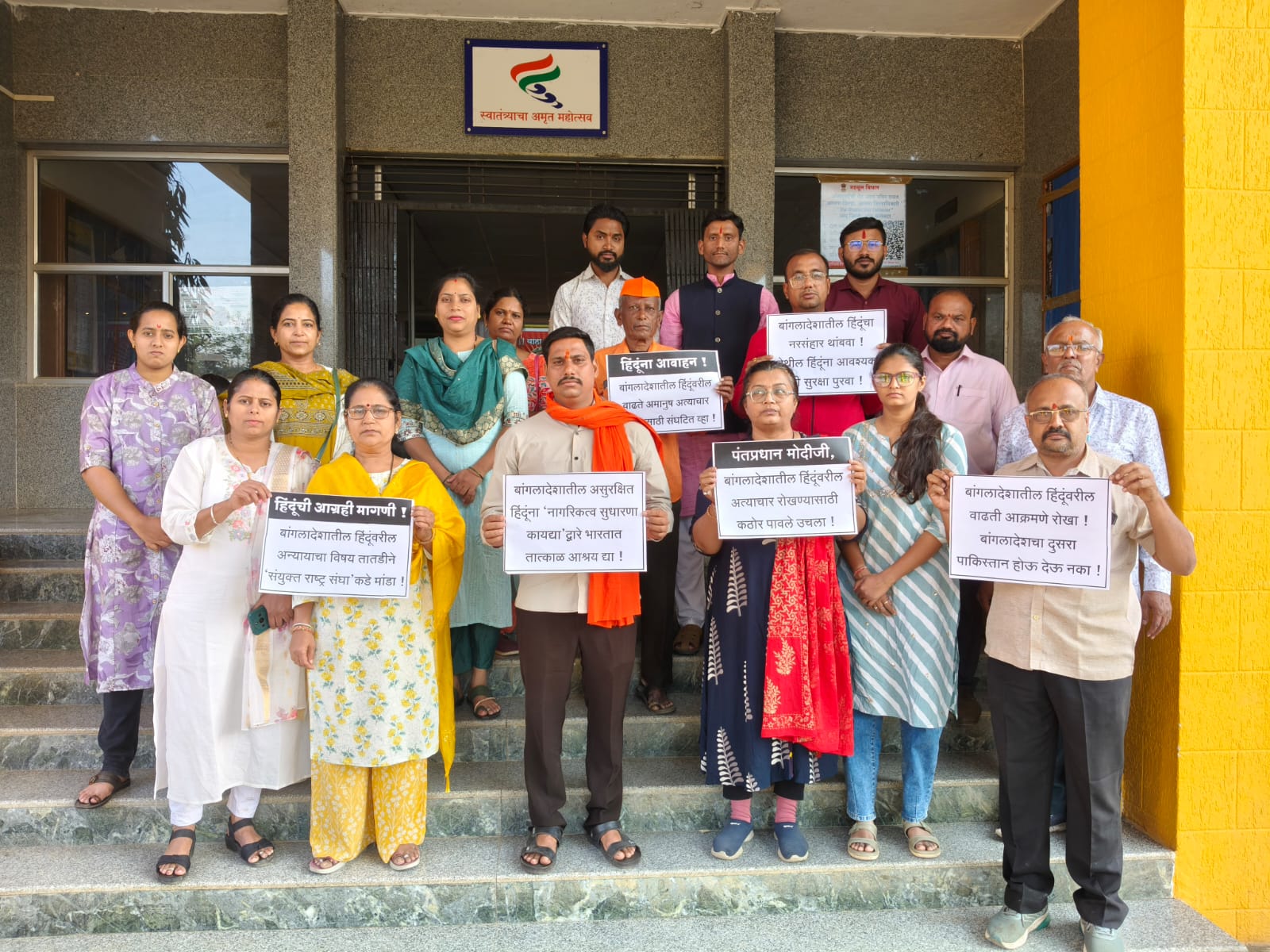 (जिल्हा– नंदुरबार) बांगलादेशातील हिंदू दीपू चंद्रदास याची कट्टरतावादी जमावाने झाडाला बांधून जिवंत जाळून हत्या करणे, हिंदूंची घरे, दुकाने जाळणे पुन्हा चालू केले आहे. हिंदु जनजागृती समितीने हिंदूविरोधी हिंसाचाराचा तीव्र निषेध करत पंतप्रधान मा. नरेंद्र मोदी, केंद्रीय गृहमंत्री मा. अमित शाह तसेच बांगलादेश उच्चायुक्त यांना कारवाई करण्यासाठीचे निवेदन नंदुरबार निवासी उपजिल्हाधिकारी श्री. भामरे साहेब यांच्या माध्यमातून सादर केले. यावेळी उद्योगपती श्री. नितेश अग्रवाल, भारतीय जनता पक्षाचे नगरसेवक श्री. पंकज चौधरी, विश्व हिंदु परिषदेचे श्री. अजय कासार, शक्ती हनुमान ट्रस्ट चे श्री. सुरेश भोई, श्री शिवप्रतिष्ठान हिंदुस्थान चे श्री. नरेंद्र तांबोळी, श्री . रवींद्र पवार, श्री. रवींद्र सोपनार, अधिवक्ता वर्षा पाटील, रणरागिणी जॉली शाह, निशा जैन, कु.अश्लेषा पवार, ध्वनी शाह, नम्रता परदेशी, सौ. स्वाती चौधरी, भावना कदम तसेच हिंदु जनजागृती समितीचे श्री. राहुल मराठे, सुमित परदेशी, हर्षल देसाई, मयूर चौधरी हे उपस्थित होते.