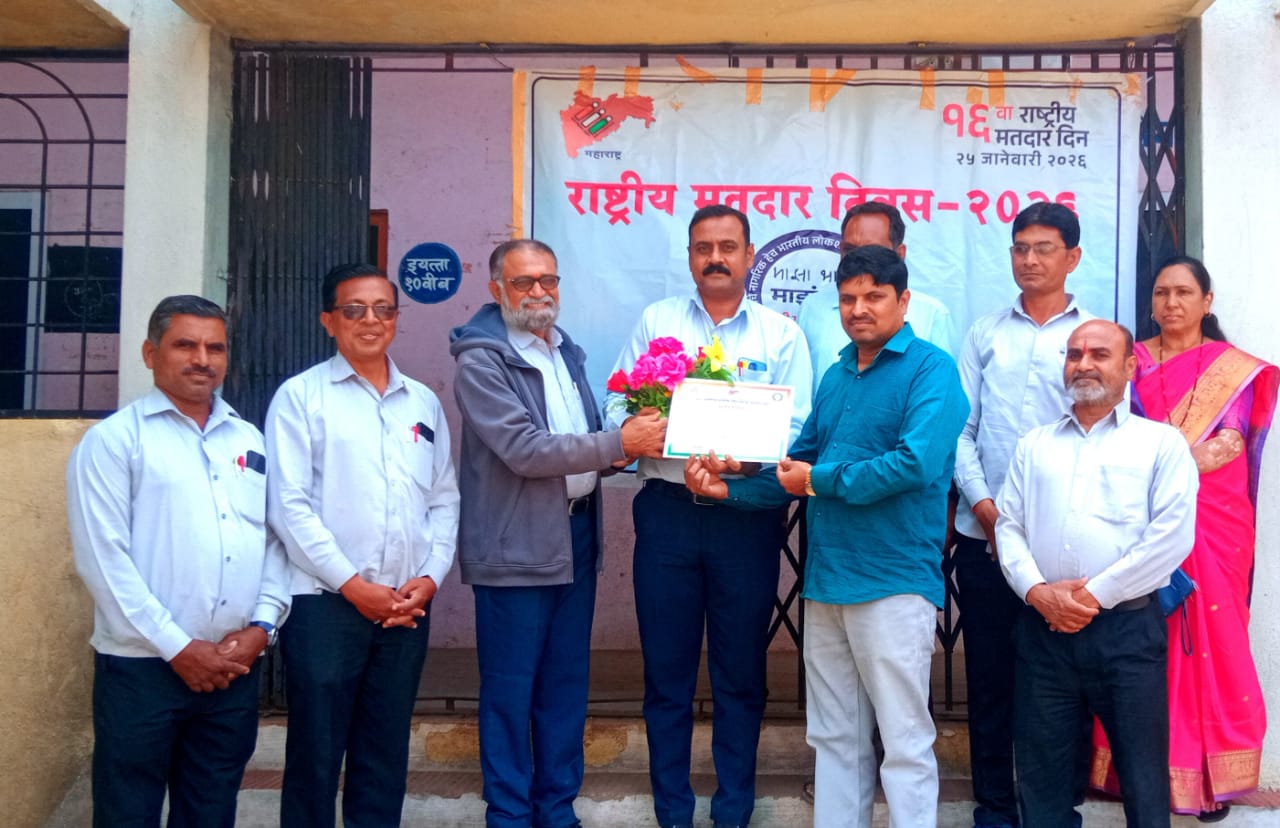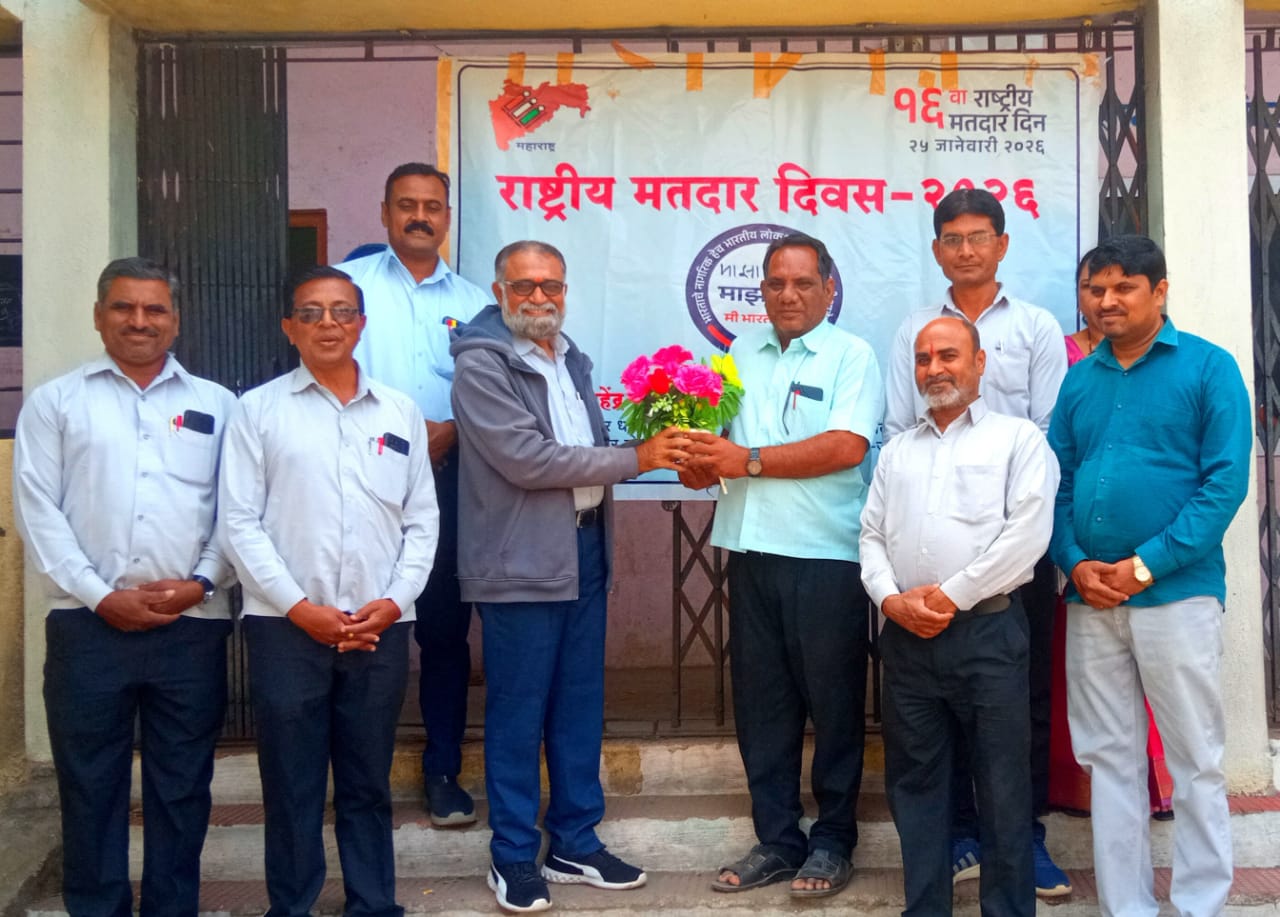 राष्ट्रीय मतदार दिनानिमित्त शाळेतील बी एल ओ एम बी मोरे ,पी डी पाटील, व्ही टी माळी, गोपाल महाजन यांचे नायब तहसिलदार सी बी देवराज यांनी पुष्पगुच्छ देऊन स्वागत केले. कार्यक्रमाचे सूत्रसंचलन पी डी पाटील तर आभार एच डी माळी यांनी मानले.